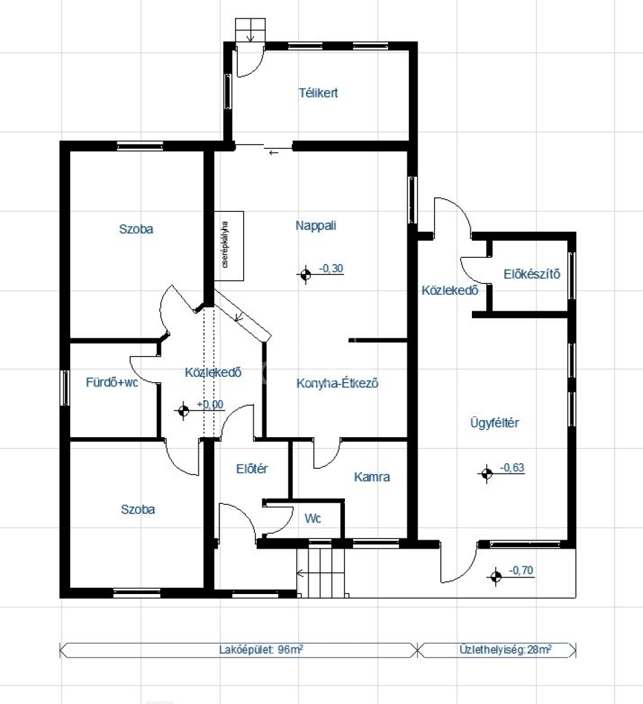 - A lépcsős és fedett bejáratról az előtérbe jutunk. Innen nyílik a 2 szoba, az amerikai konyhás nappali; a nappaliból nyíló télikert, a fürdőszoba és WC.