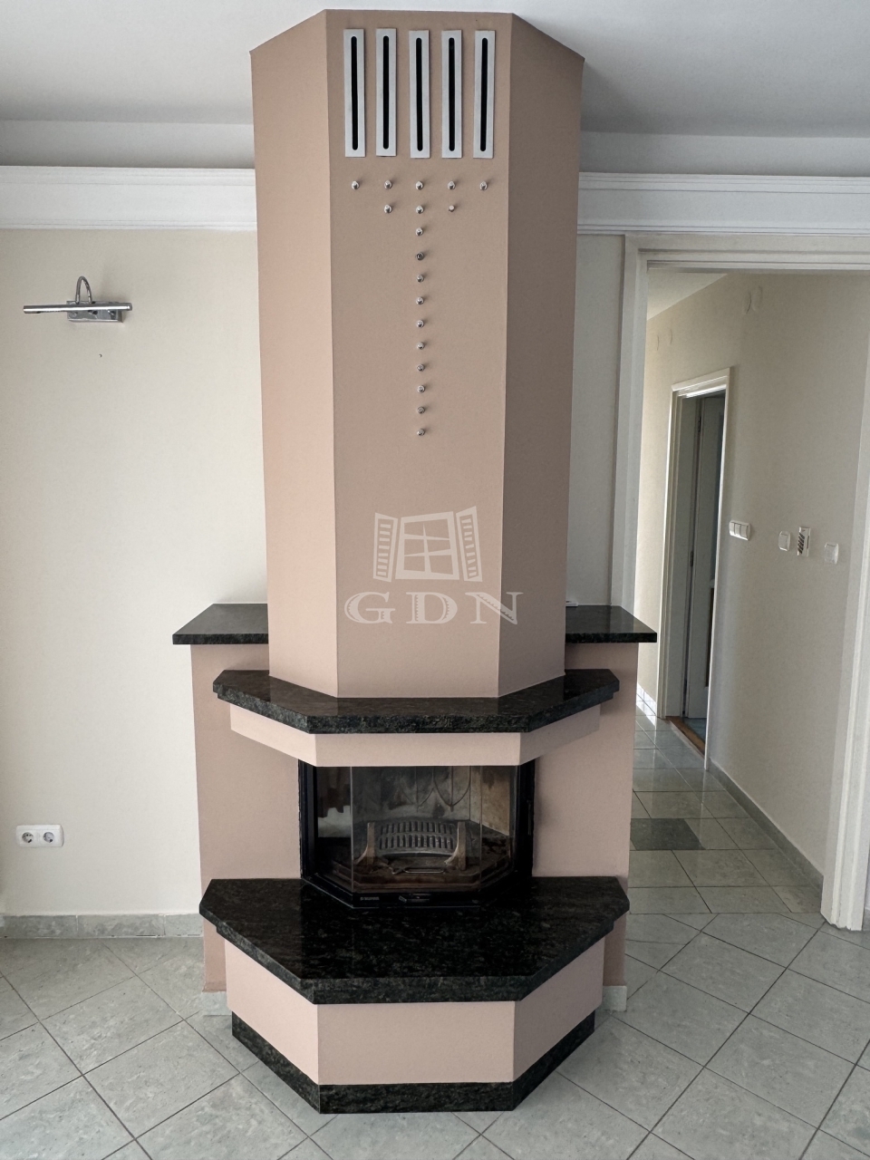 radiátor hőleadókkal, 2 db légkondicionáló, nappaliban üvegfalú kandalló