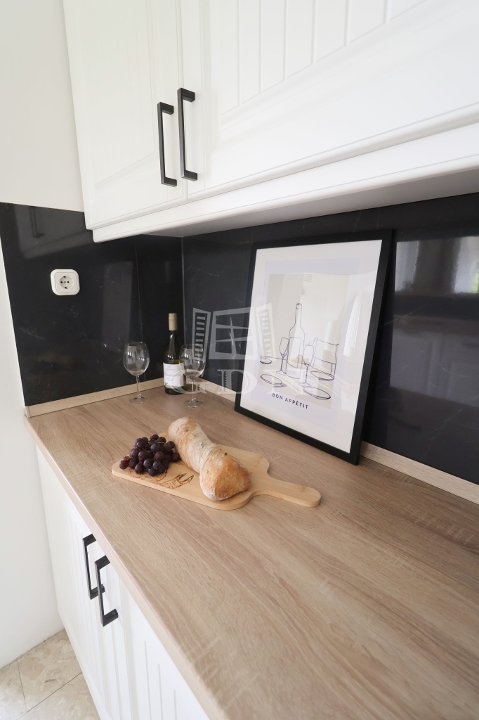A teljes festés friss, világos megjelenést biztosít, míg a nappaliban és a szülői hálóban elhelyezett dekor tapéták egyedi hangulatot teremtenek.