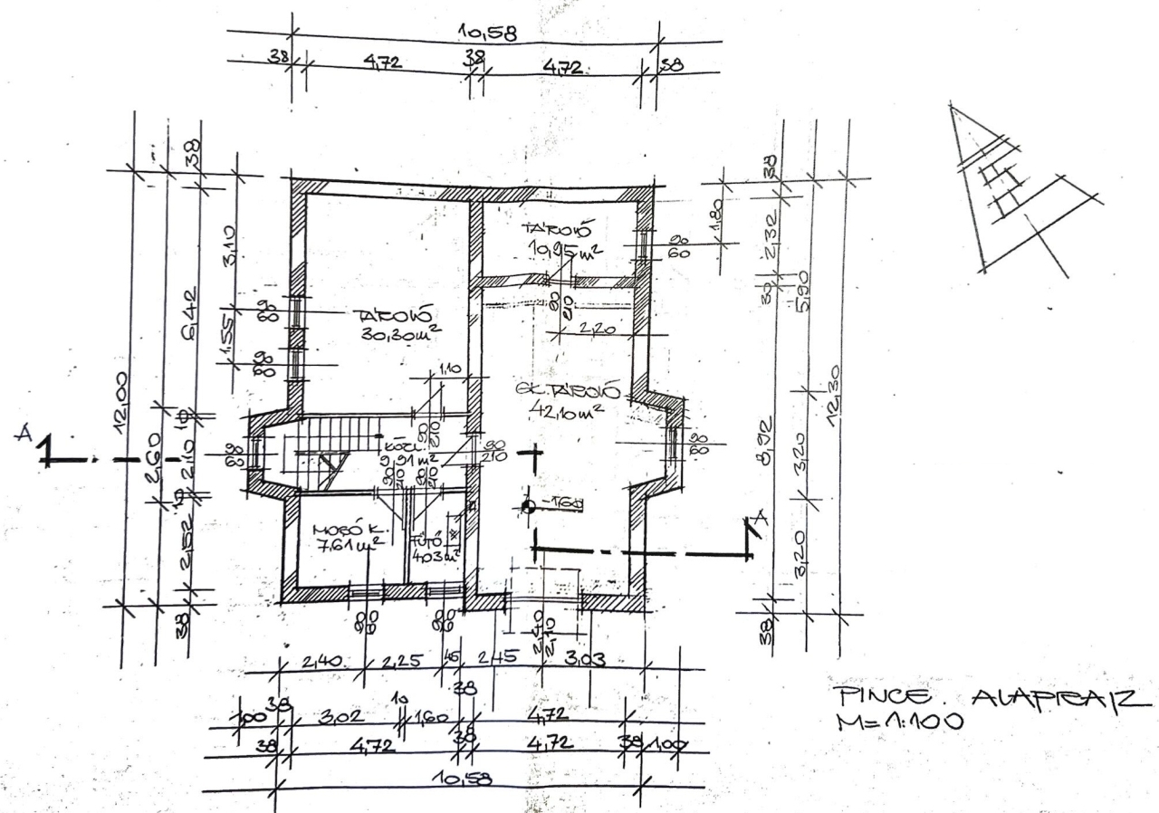 Az ingatlan elosztása: pinceszint + magasföldszint + tetőtér, a 3 szint teljes bruttó alapterülete összesen 308,63 m² , szintekre bontva pince 104,9 m² ; magadföldszint 106,61 m² ; tetőtér bruttó 97,02 m² ( nettó 79,2 m² az 1,9 méter alatti területtel számolva ).