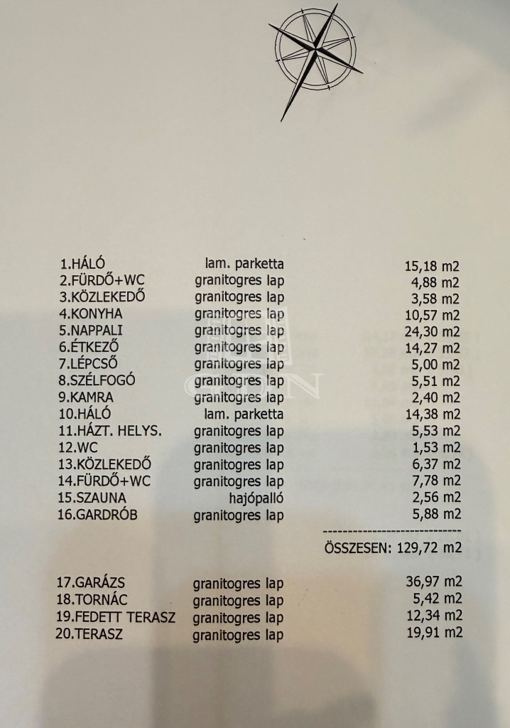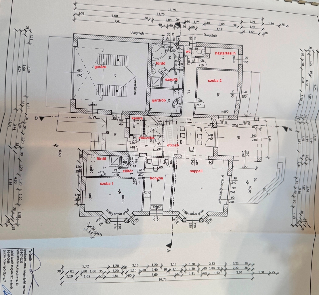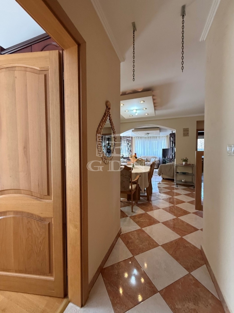 Földszint : Az előtér a ház központi terébe nyílik, a bejárati ajtótól jobbra egy- akár külön választható lakrészként- 1 hálószoba, előszoba, fürdő wc-vel helyezkedik el, közvetlen bejutással a minden funkcióval felszerelt konyhába. A bejárati ajtótól balra van a garázs (külön bejárattal), és az előszobából balra egy kamra. A bejárati ajtóval szemben az előszobából az étkezőbe jutunk , itt található még a földszinten egy tágas világos nappali, 1 gardrób, egy fürdő wc-vel, szaunával, háztartásihelyiség, vendég wc, és egy hálószoba.