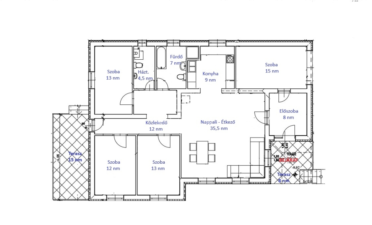Falazata 30 cm-es tégla, 10 cm hőszigeteléssel. A födém vasbeton, mely lehetőséget ad a tetőtér beépítésére.