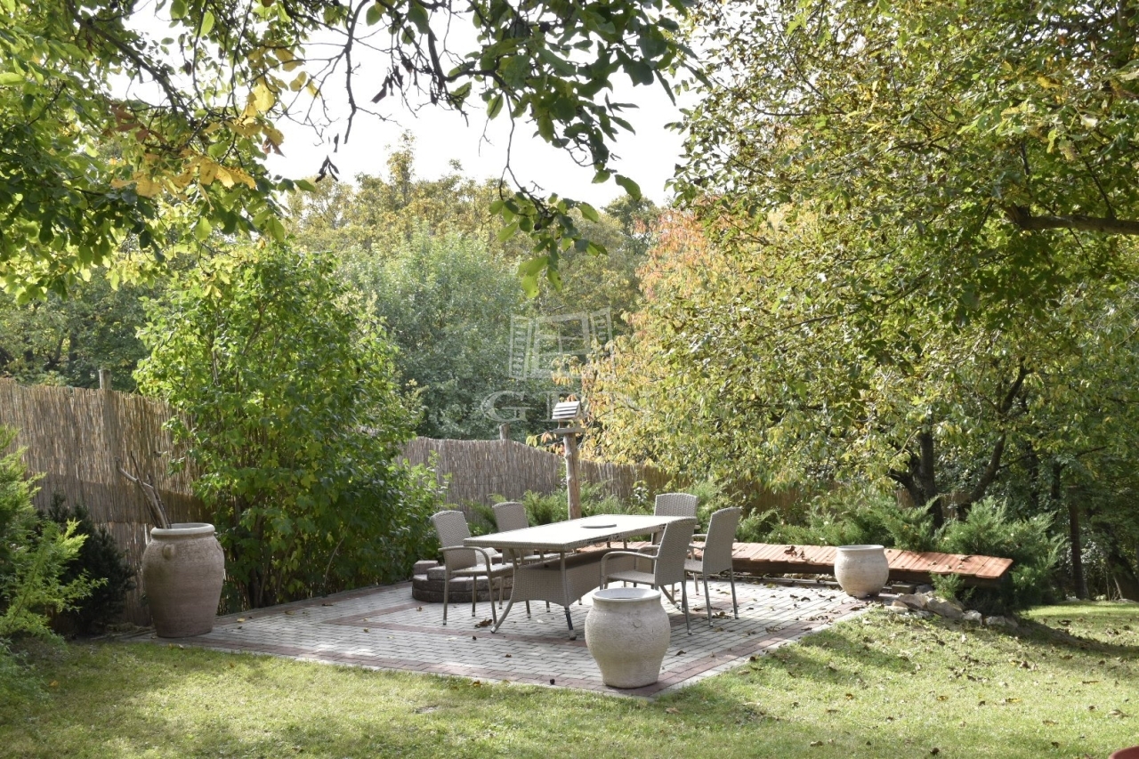 A gondosan megtervezett udvarban gyümölcsfák, bokrok, örökzöldek és virágok teszik idillivé a környezetet. Egy mediterrán hangulatú, fedetlen szaletli hív pihenésre, a telek alján pedig egy kis patak csörgedezik, tovább fokozva a természetközeli atmoszférát.
