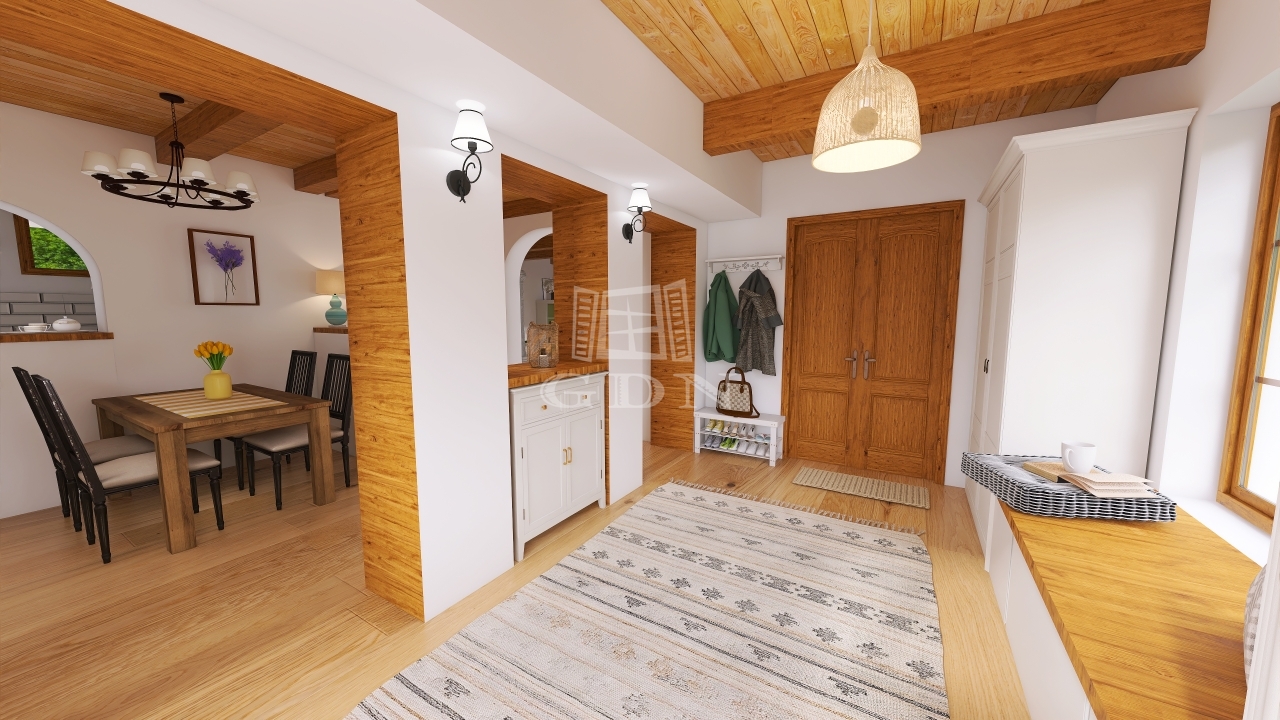 A lakrész egy hangulatos teraszból, utcafronti nagy nappaliból, étkezőből, konyhából, tágas hálószobából és fürdőszobából áll. Az eredeti, százéves gerendák gondos felújításon estek át, megőrizve a ház autentikus báját.